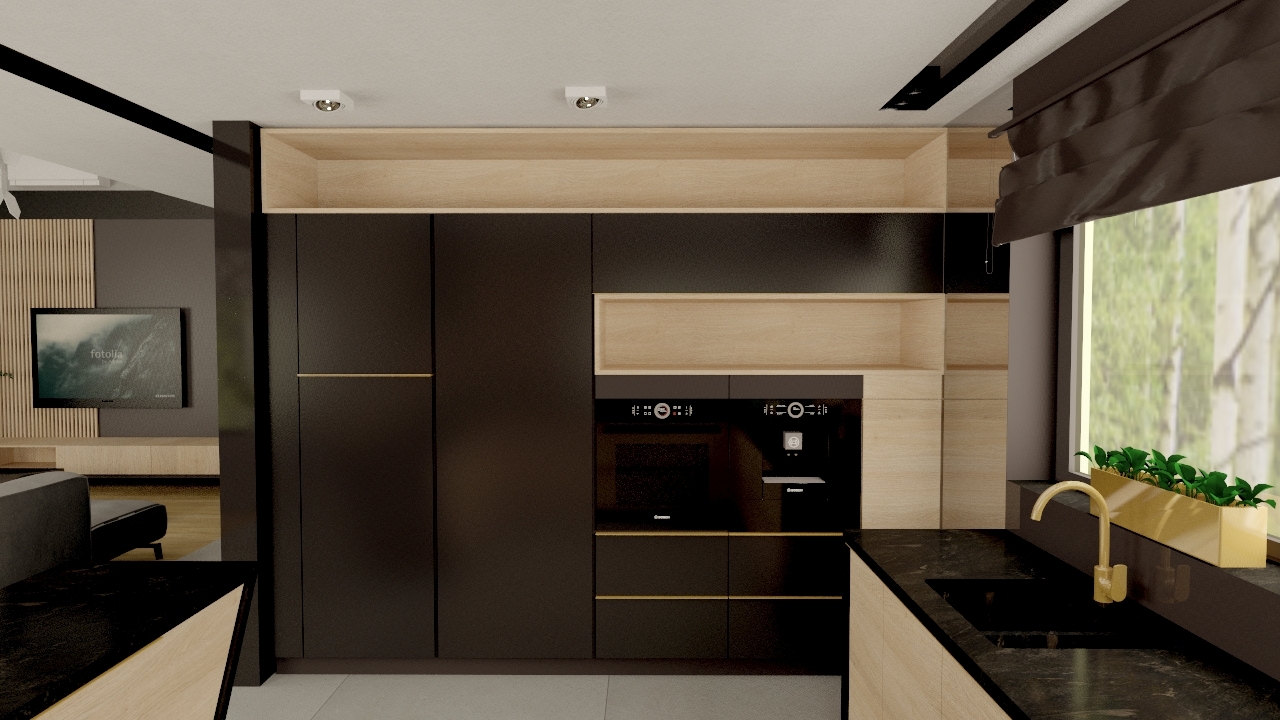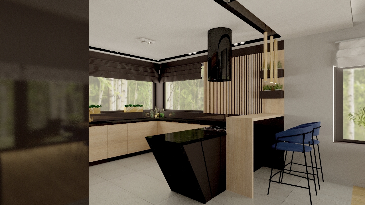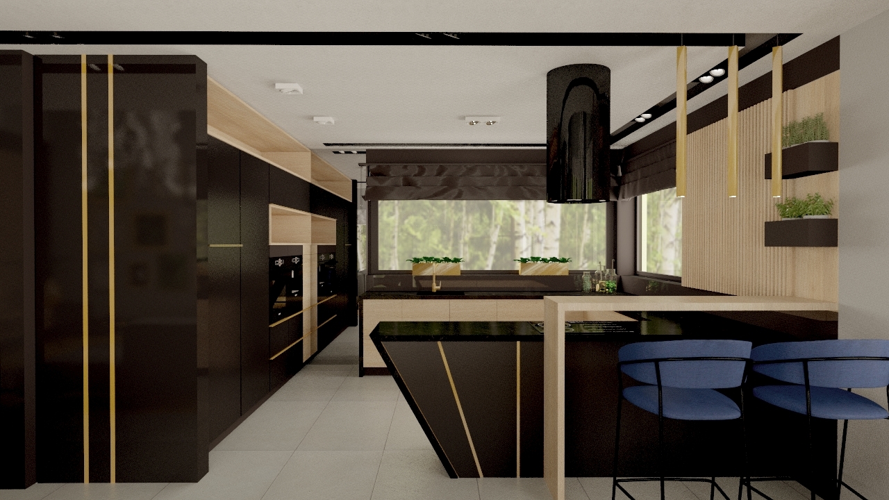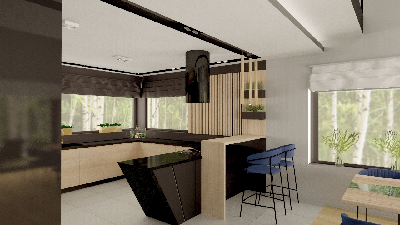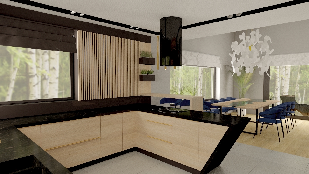 Wspaniały, nowoczesny dom z antresolą i baaaardzo wysokim salonem. Odważni i zdecydowani inwestorzy, postawili na ciemną kolorystykę mebli kuchennych o bardzo niebanalnych kształtach. Całość nie została nimi przytłoczona ponieważ mamy tutaj przepiękne, wielkie okna, które są ramami dla cudownego pejzażu, który się za nimi maluje. Praca nad tym projektem była wspaniałym, twórczym procesem.