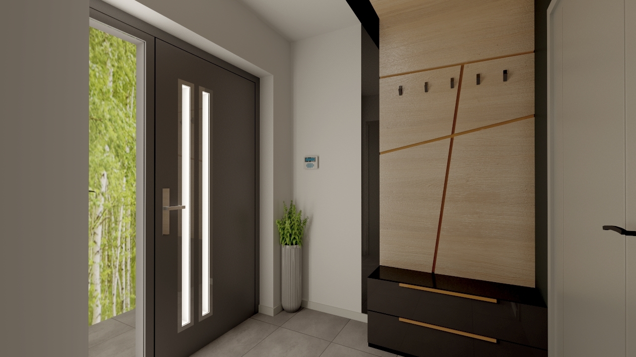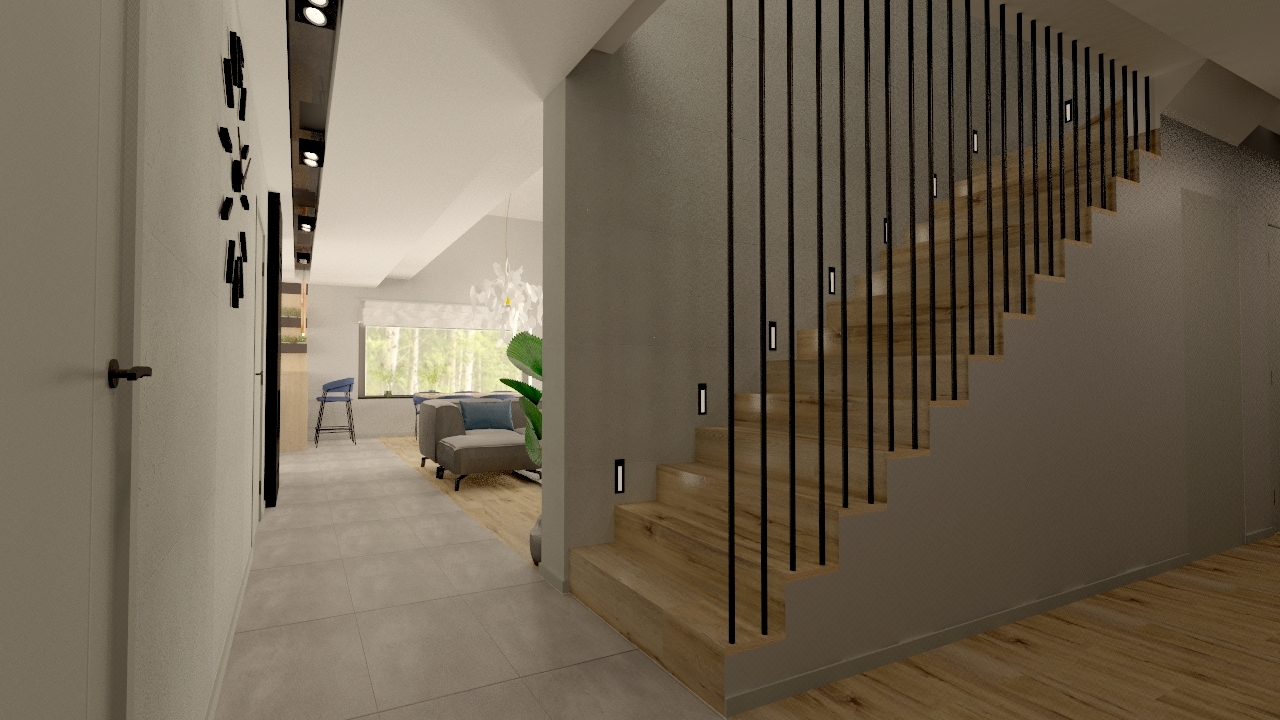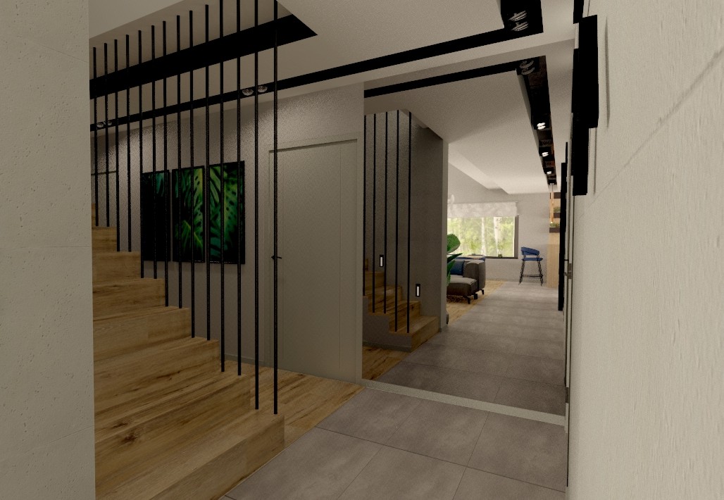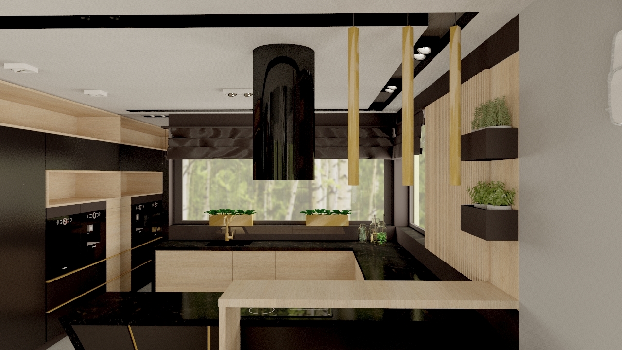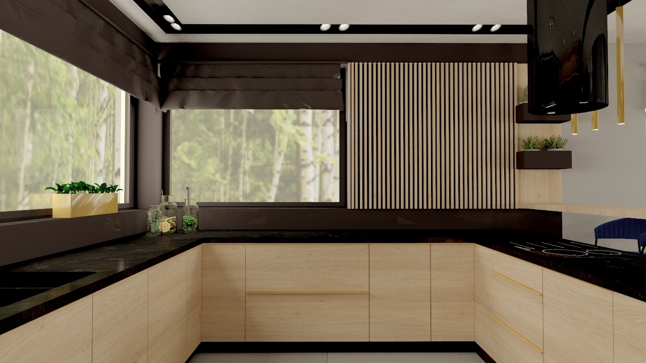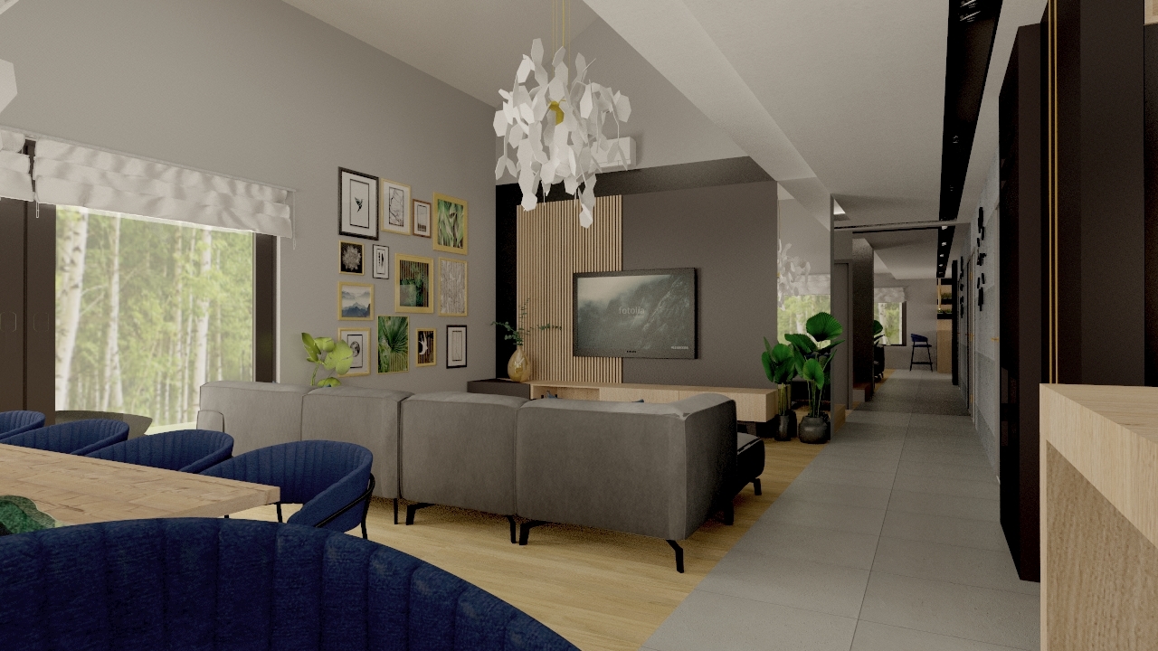 Wspaniały, nowoczesny dom z antresolą i baaaardzo wysokim salonem. Odważni i zdecydowani inwestorzy, postawili na ciemną kolorystykę mebli kuchennych o bardzo niebanalnych kształtach. Całość nie została nimi przytłoczona ponieważ mamy tutaj przepiękne, wielkie okna, które są ramami dla cudownego pejzażu, który się za nimi maluje. Praca nad tym projektem była wspaniałym, twórczym procesem.