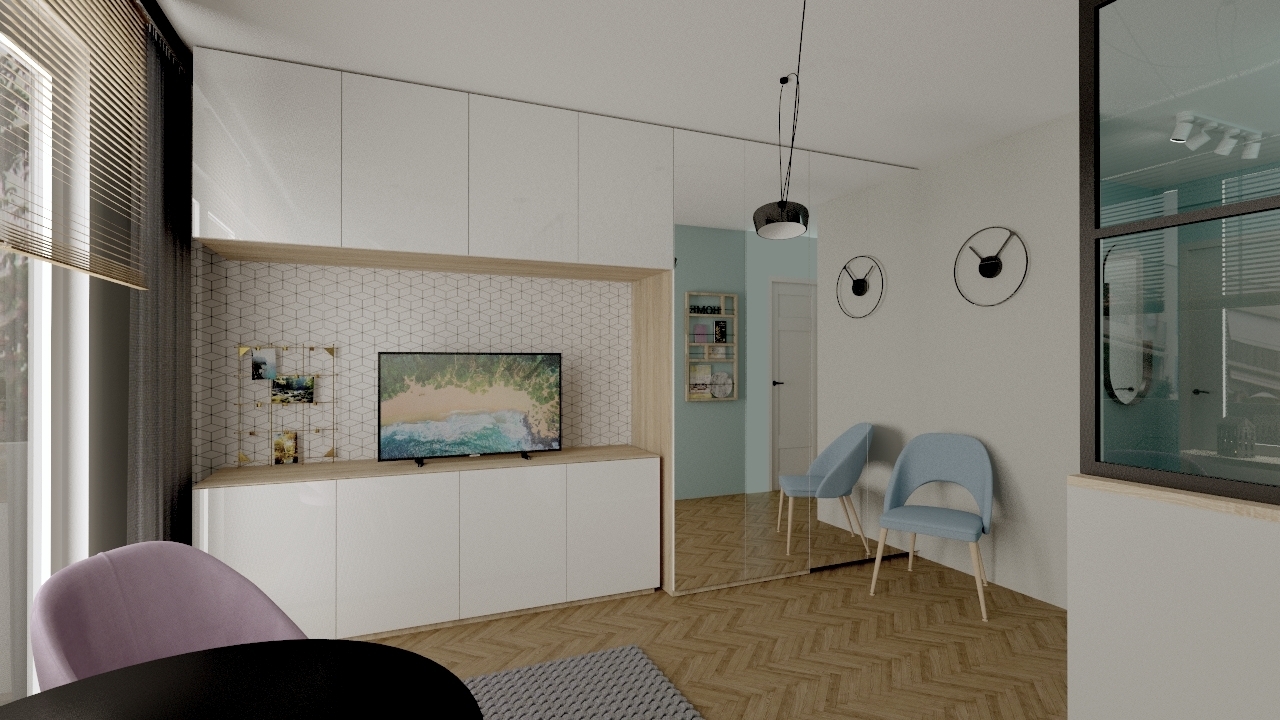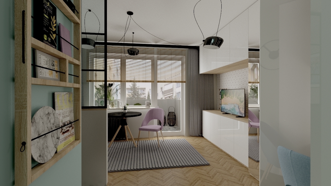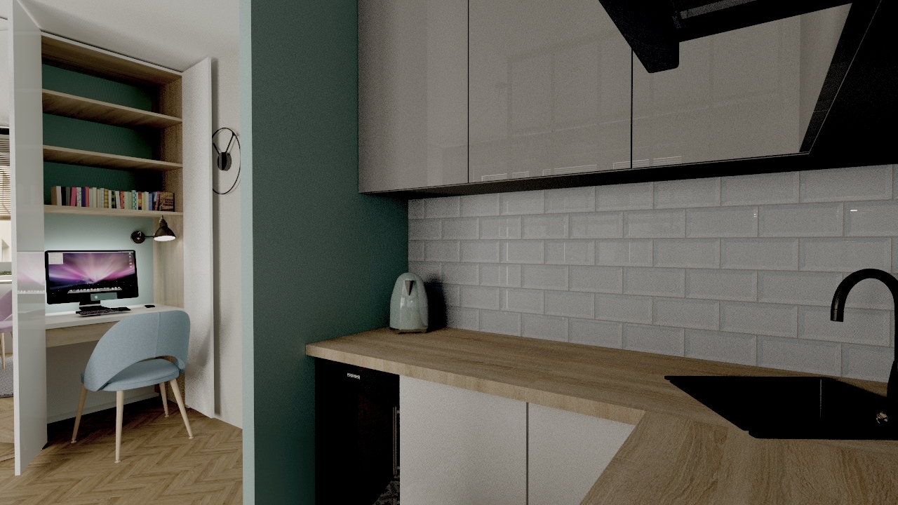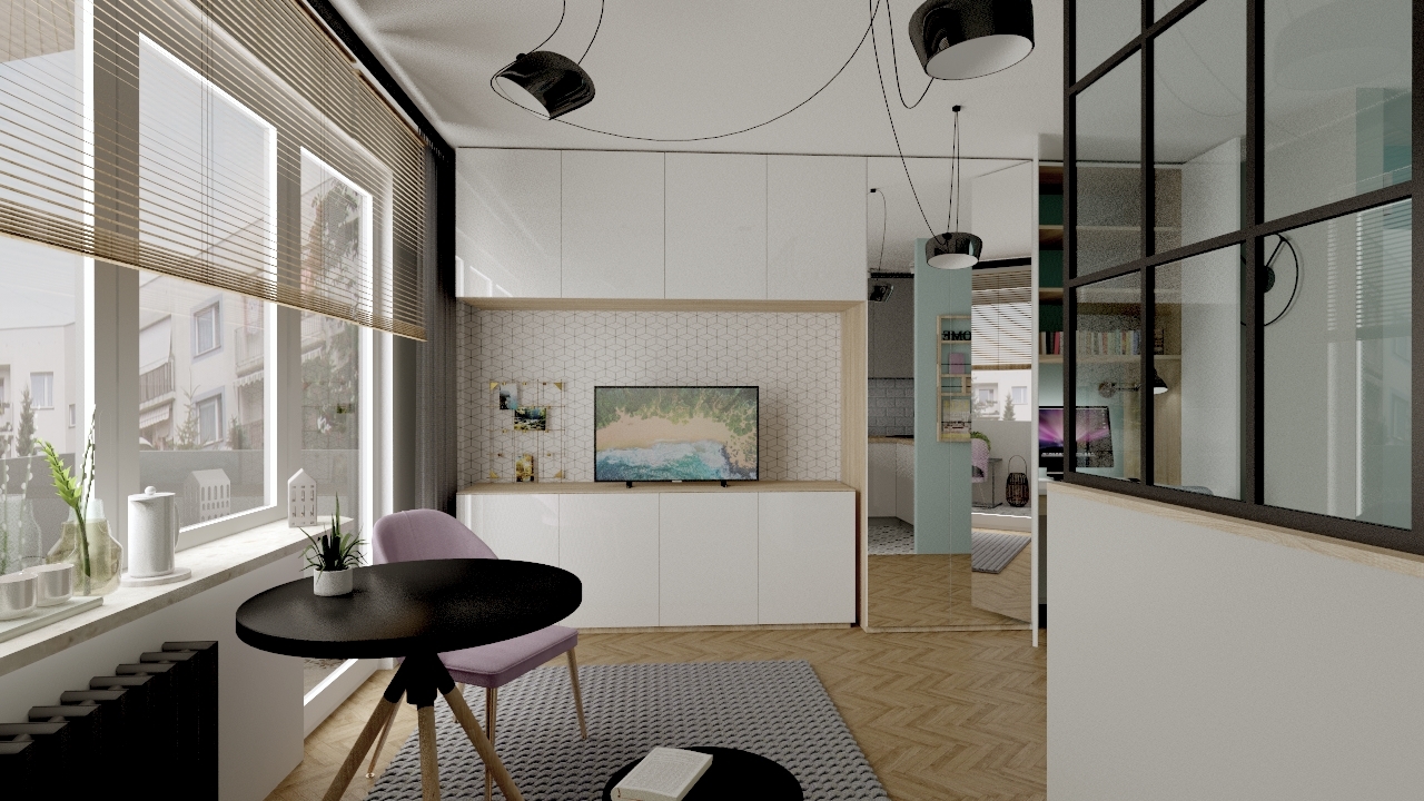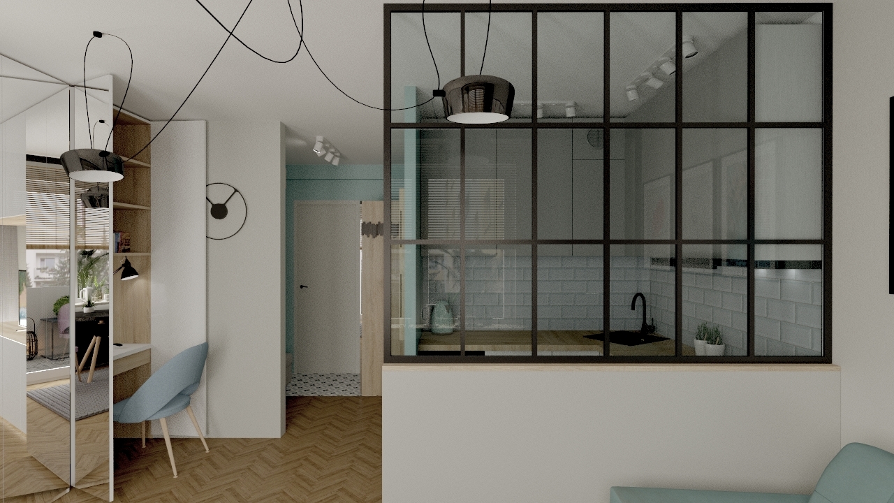 Maleńka kawalerka, została zaprojektowana przeze mnie w taki sposób, żeby wykorzystać maksymalnie przestrzeń do przechowywania, jednocześnie nie przytłaczając wnętrza nadmiarem mebli i elementów wyposażenia. W efekcie przestrzeń jest jasna, przejrzysta i ciekawa. Wspaniale spełnia wszystkie funkcje, łącznie z małym aneksem biurowym schowanym w szafie. Niewielka, ale wygodna część kuchenna, jest doświetlona dzięki przeszklonej ściance, co wpływa na funkcjonalność, ale także na efekt wizualny całego mieszkania.