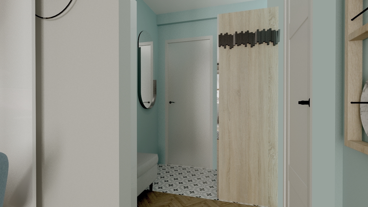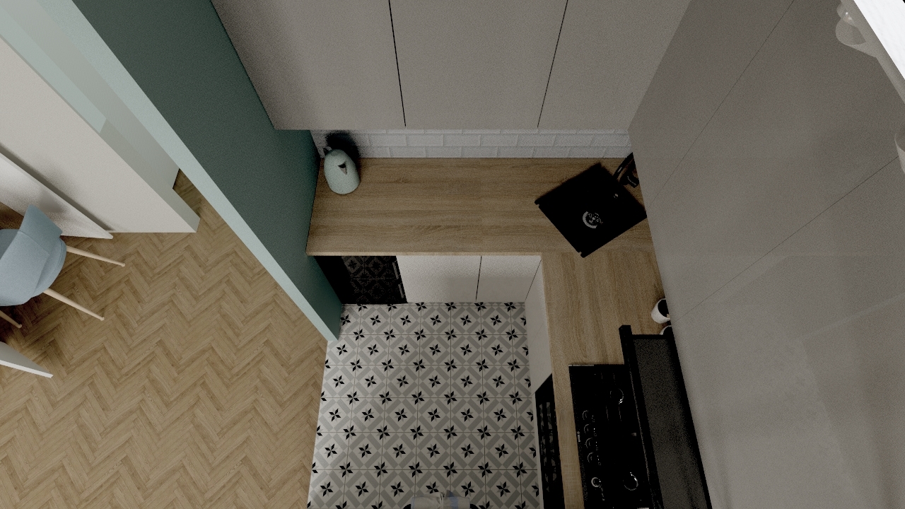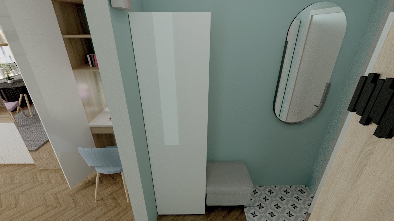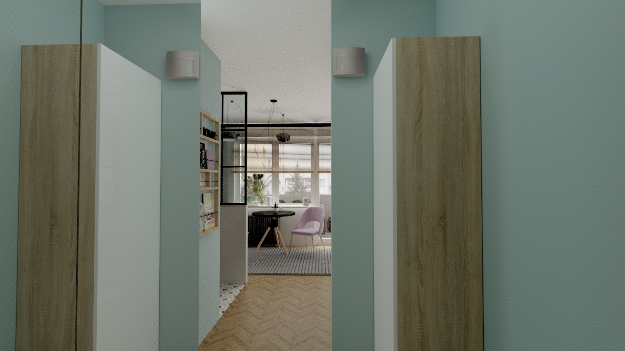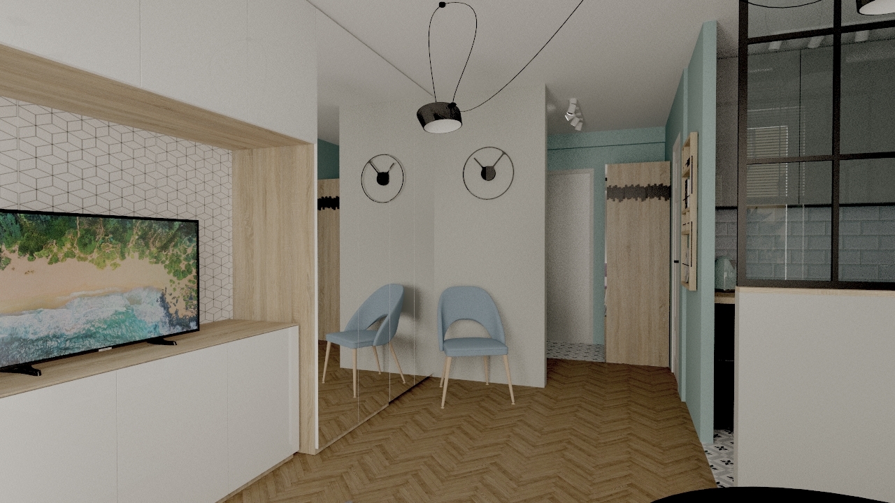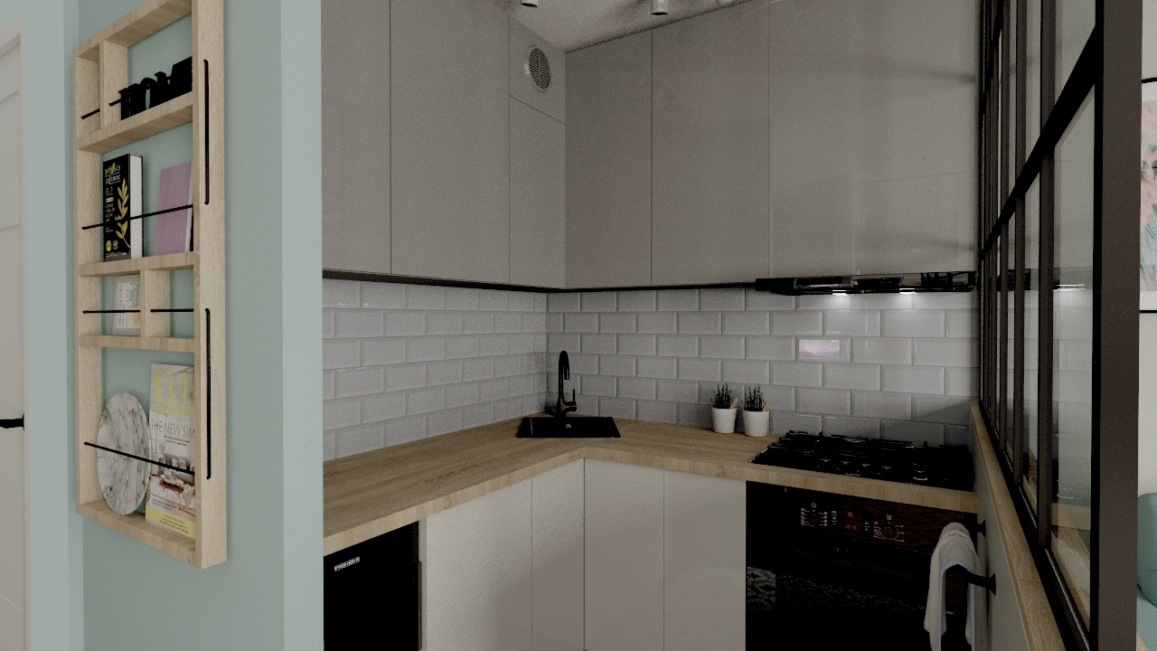 Maleńka kawalerka, została zaprojektowana przeze mnie w taki sposób, żeby wykorzystać maksymalnie przestrzeń do przechowywania, jednocześnie nie przytłaczając wnętrza nadmiarem mebli i elementów wyposażenia. W efekcie przestrzeń jest jasna, przejrzysta i ciekawa. Wspaniale spełnia wszystkie funkcje, łącznie z małym aneksem biurowym schowanym w szafie. Niewielka, ale wygodna część kuchenna, jest doświetlona dzięki przeszklonej ściance, co wpływa na funkcjonalność, ale także na efekt wizualny całego mieszkania.