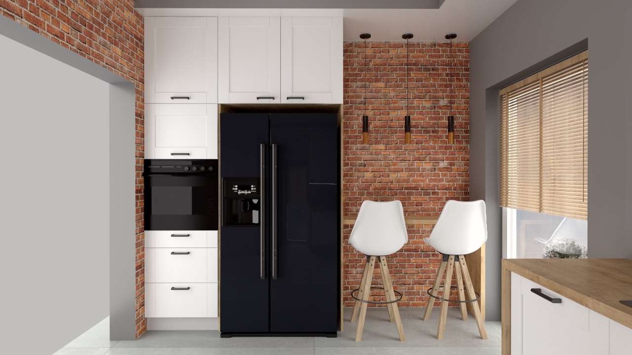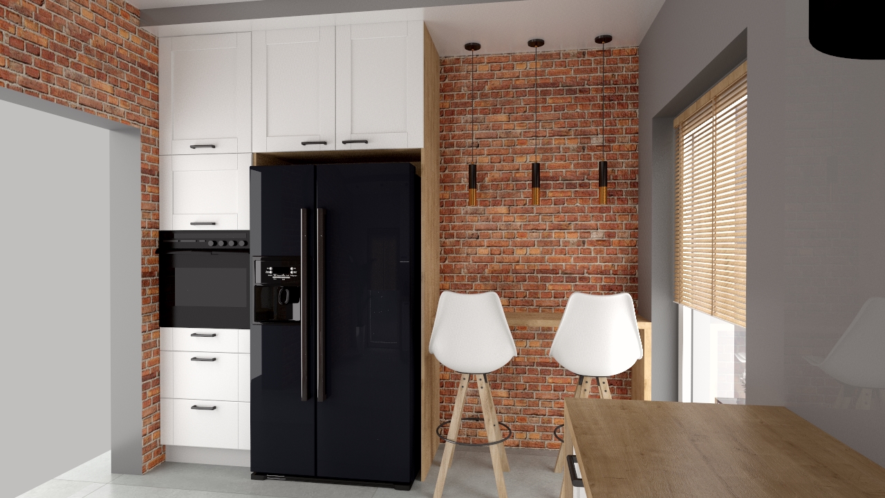Projekt maleńkiej kuchni w biurowcu. Wspaniale spełnia potrzeby pracowników, jednocześnie ciesząc oko industrialnym stylem, uzyskanym poprzez niebanalny dobór materiałów i kolorystyki.
