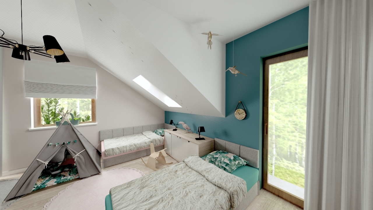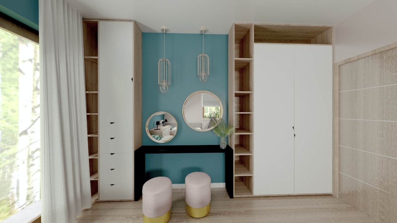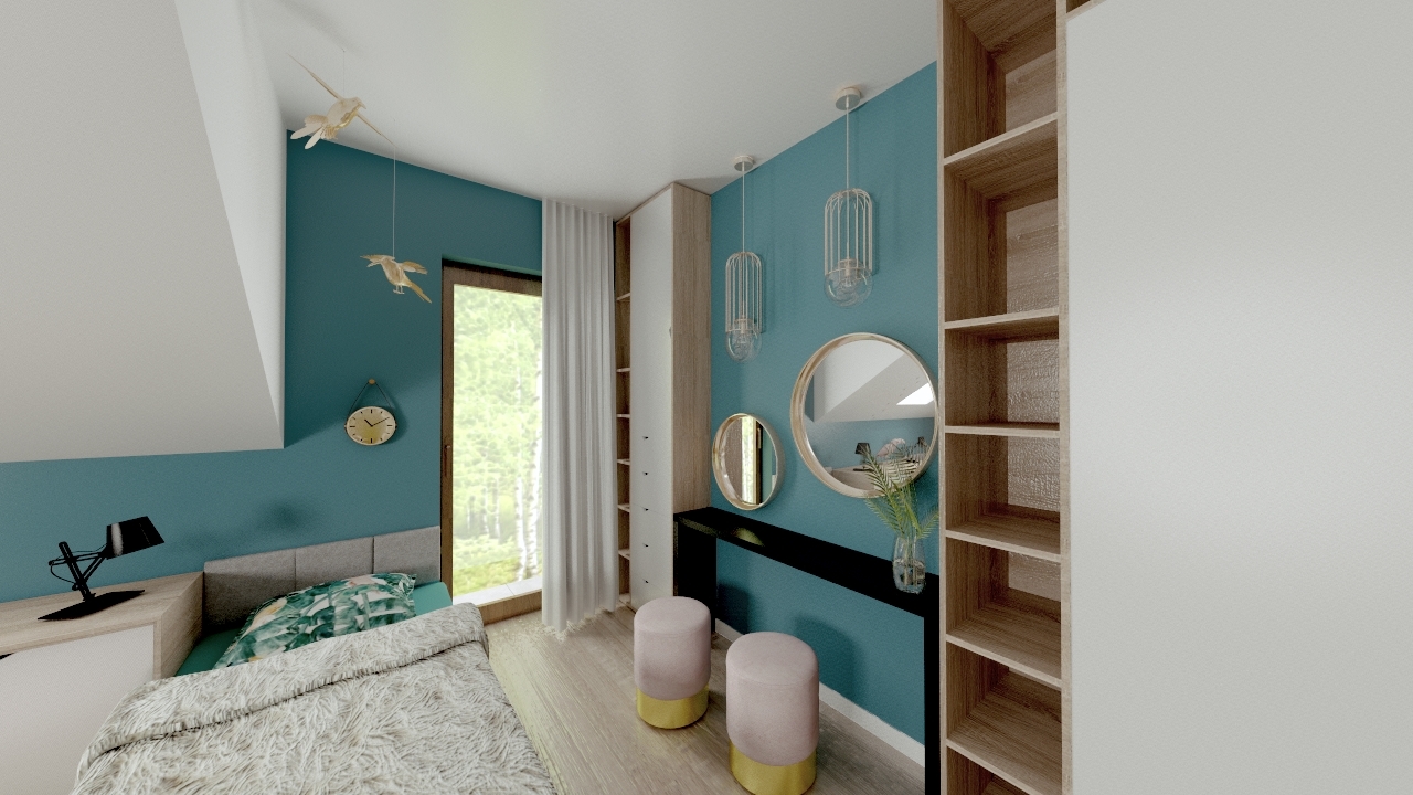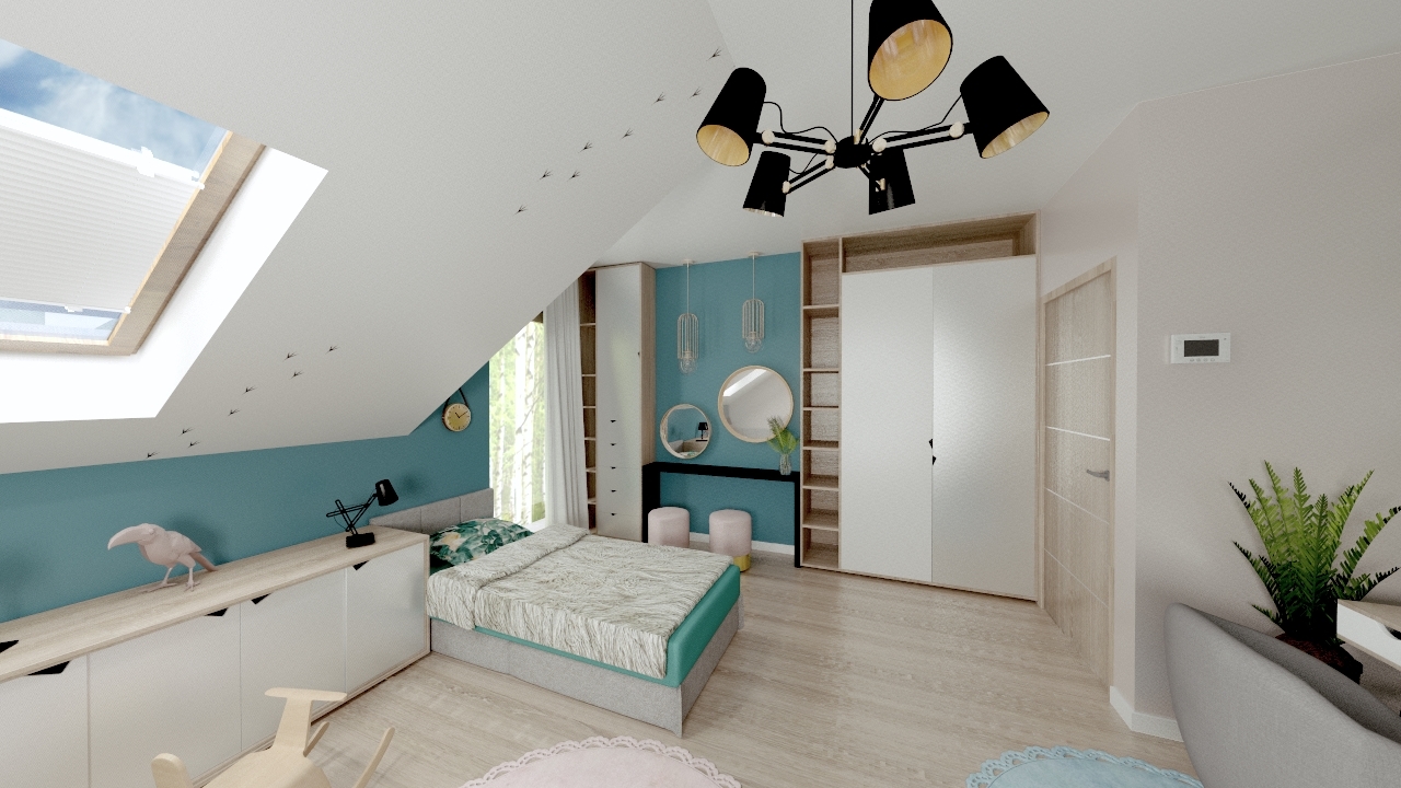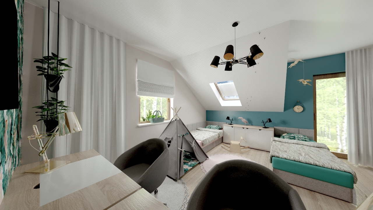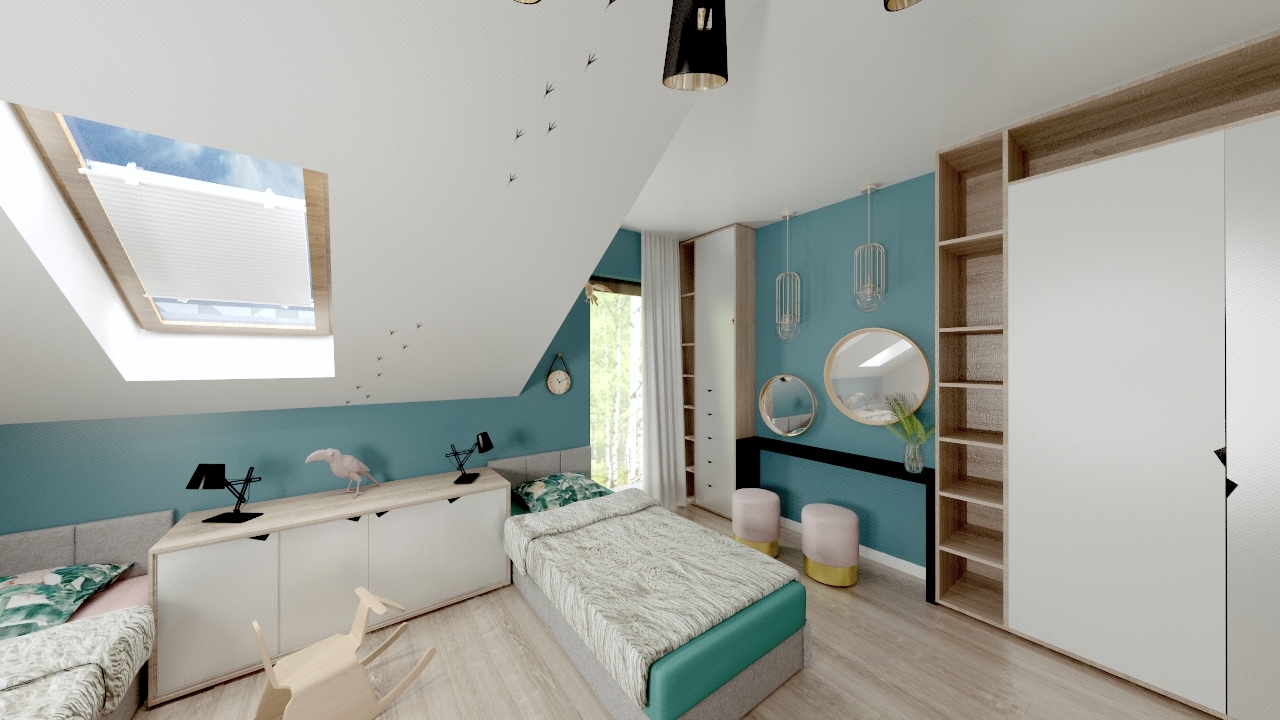 Przestrzeń zaprojektowałam tak, aby jak najlepiej spełniała funkcjonalne potrzeby swoich użytkowniczek. Wstawiłam niezbędne elementy- łóżka, biurka, szafy i przestrzeń do przechowywania. Uznałam, że styl „jungle” będzie ponadczasowym mianownikiem, który połączy gust tych dwóch dziewczynek. Do tego dodałam oczywiście podwójną toaletkę, która łączy upodobania większości kobiet, również tak młodych 🙂